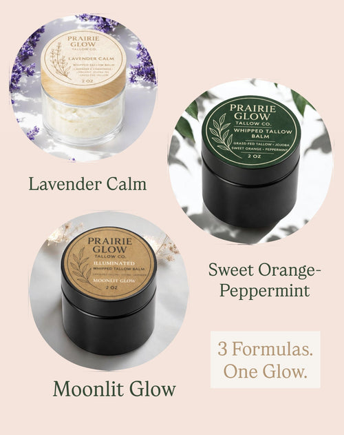 Our Prairie Glow Tallow Balm is a deeply nourishing moisturizer made from 100% grass-fed & finished Idaho beef tallow, blended with organic oils and essential oils.